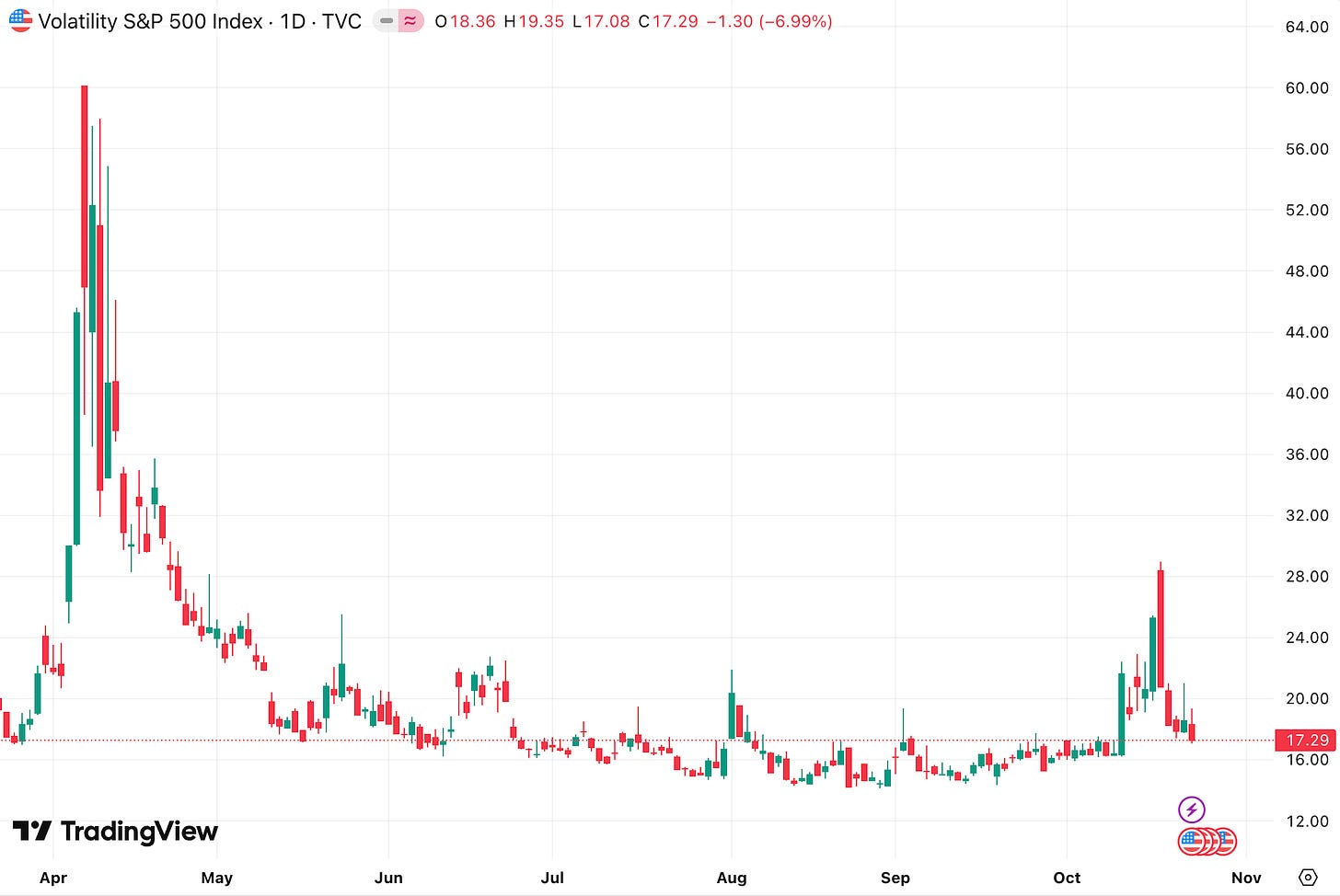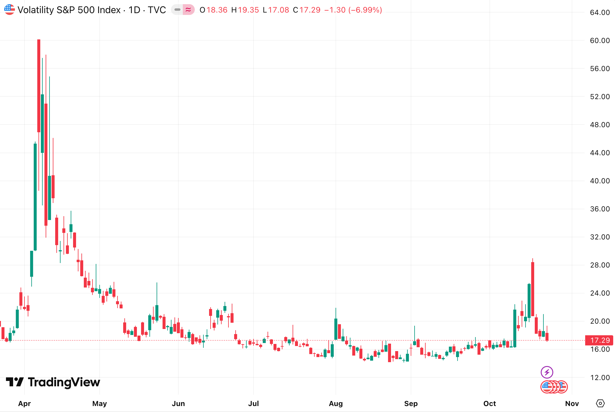 17.29 (-6.99%) - volatility easing back to pre-spike levels, signaling a calmer risk environment.
