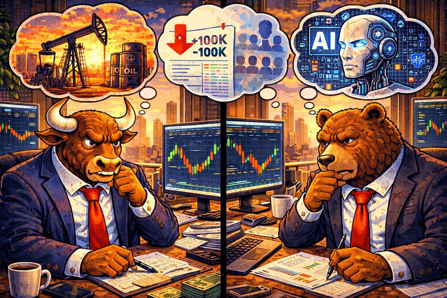 βͺ Neutral β Equities are mixed, volatility is lower, and markets are digesting oil weakness and upcoming data.