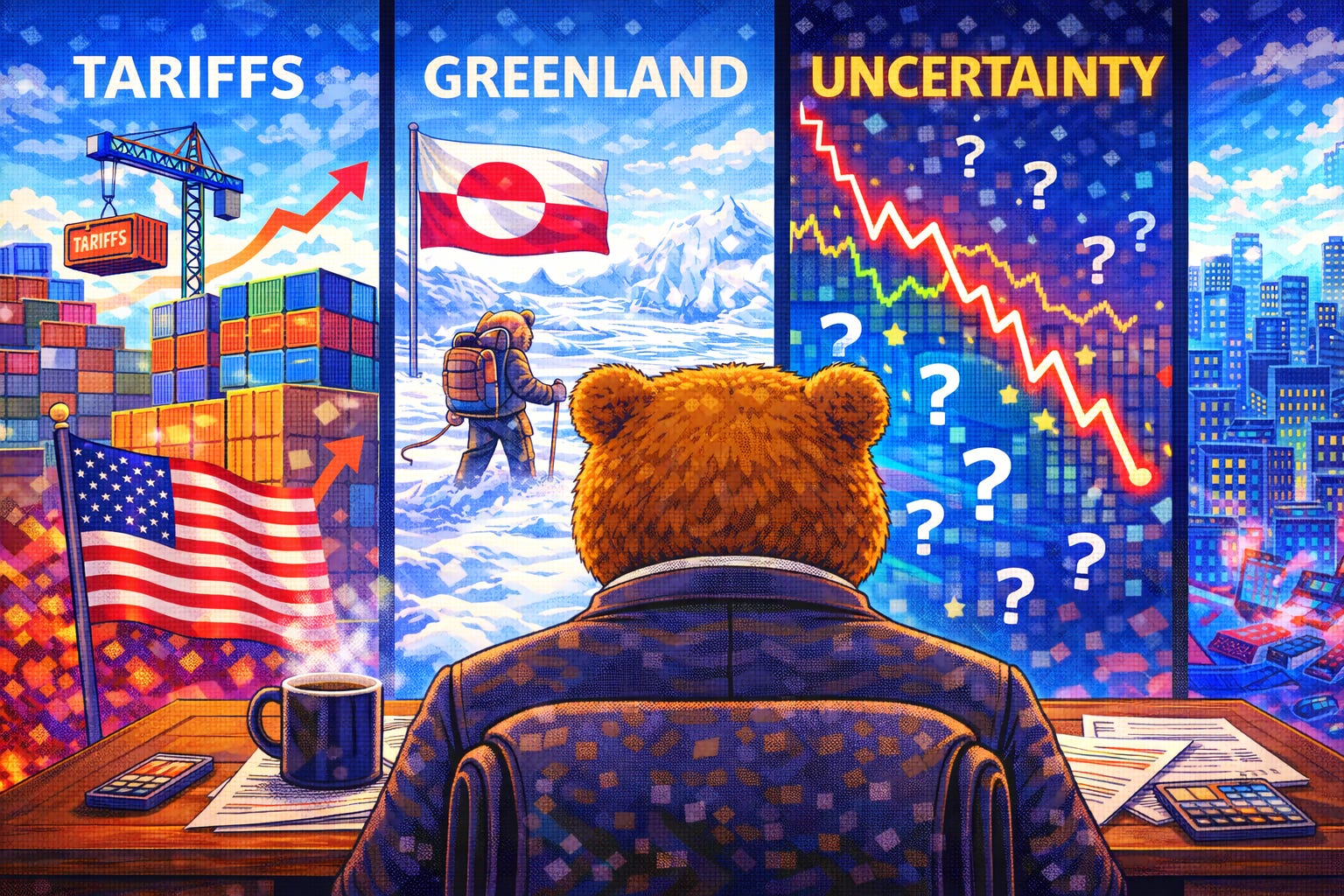 Stocks and Treasuries pressured by renewed focus on US tariff threats tied to Greenland.